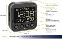 Type d’écran: numérique, Signal radio: Oui, Nombre de fuseaux horaires: 1 ×, Fonctions: Fonction snooze, Alarme, Équipement: Date, Rétroéclairage, Jour de la semaine, Source d’énergie: Piles